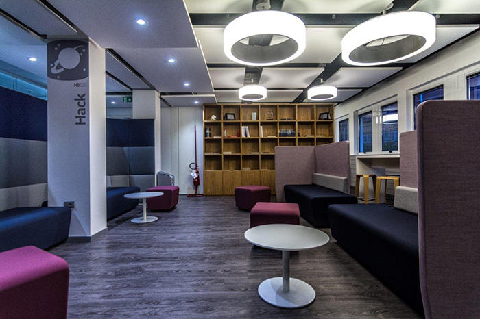 Vista dell'area comune allestita con sedute e tavolini con varie altezze.
