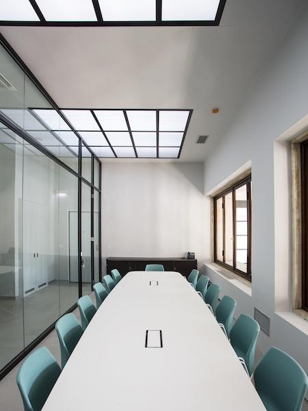 Sala riunioni compartimentata con pareti vetrate a tutta altezza.